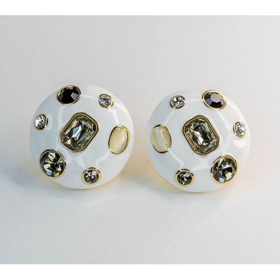 Серьги из гипоаллергенного ювелирного сплава желтого цвета. Покрытие эмалью белого цвета. Вставка - гелиотис (перламутр), цвет - бежевый и ювелирное стекло, цвет-белый,черный, коньячный. Итальянский замок (швенза - 1,2см и застежка-клипса). Диаметр серег - 3см.