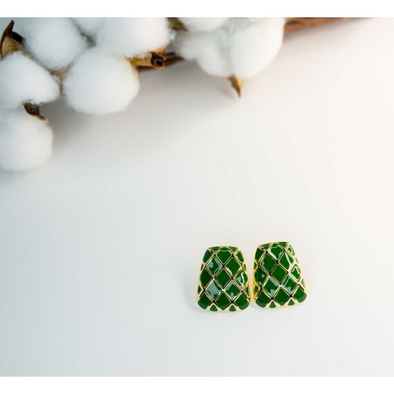 Серьги женские из гипоаллергенного ювелирного сплава желтого цвета с покрытием эмалью зеленого цвета. Без вставок. Высота серег-2,0см, ширина- 2,0см. Застежка- пусет.
