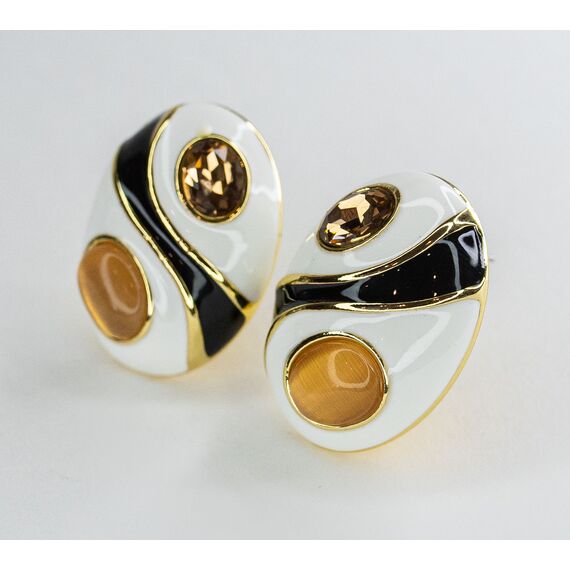 Серьги из гипоаллергенного ювелирного сплава, цвет - желтый. Покрытие эмалью горячим способом белого и черного цвета. Вставка - ювелирное стекло, цвет - коричневый и улексит (кошачий глаз), цвет - желтый.