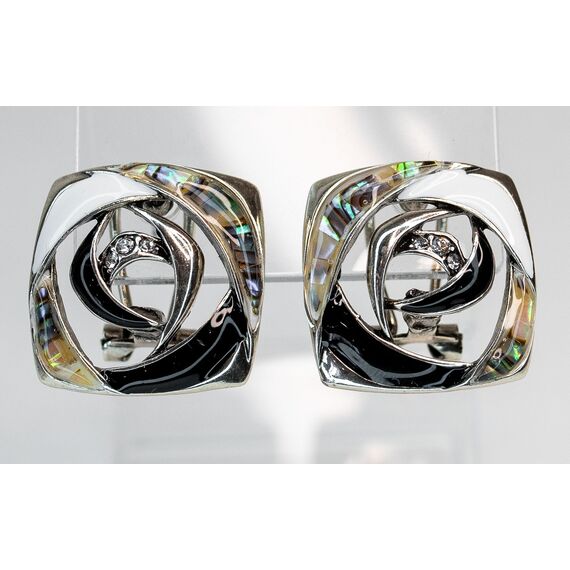 Серьги из гипоаллергенного ювелирного сплава серого цвета. Покрытие эмалью белого и черного цвета. Вставка - гелиотис (перламутр) и ювелирное стекло, цвет-белый. Итальянский замок (швенза - 1,2см и застежка-клипса). Высота серег - 2см, ширина - 2,2см.