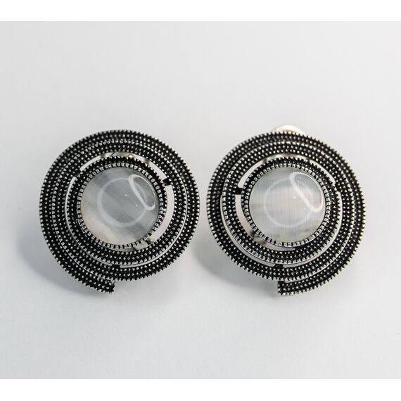 Серьги из гипоаллергенного ювелирного сплава серого цвета . Вставка- агат серого цвета. Итальянский замок (швенза-1,2см и застежка-клипса). Высота серег-2,5см, ширина-2,5см.Диаметр камня-1см.