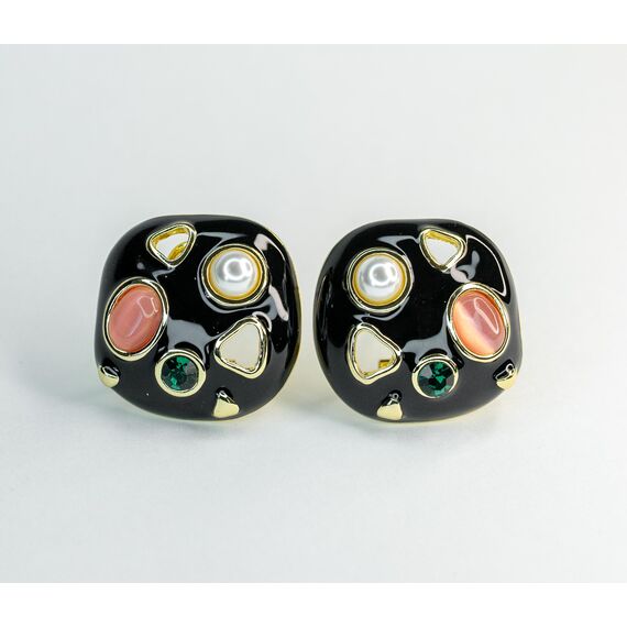 Серьги из гипоаллергенного ювелирного сплава желтого цвета. Покрытие эмалью черного цвета. Вставка - жемчуг белого цвета, гелиотис ( перламутр), цвет -розовый и ювелирное стекло, цвет - зеленый. Итальянский замок (швенза - 1,2см и застежка - клипса). Высота и ширина серег - 2,6см.