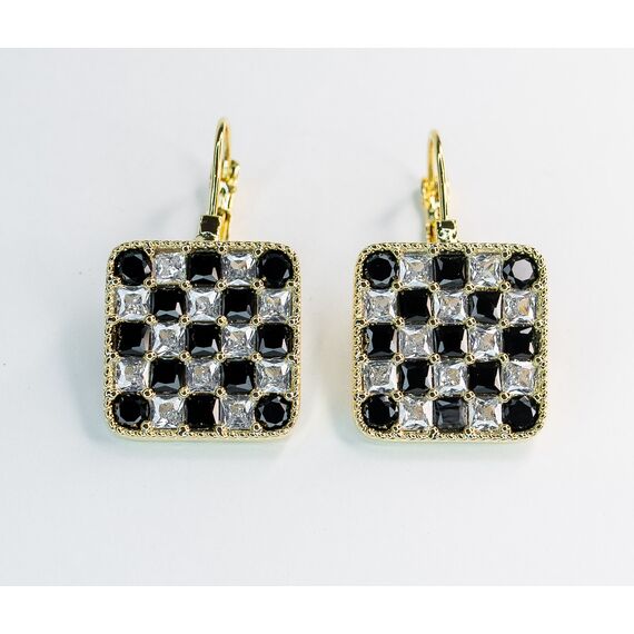 Серьги из гипоаллергенного ювелирного сплава желтого цвета. Вставка-ювелирное стекло белого и черного цвета. Высота серег-3см, ширина-1,7см. Застежка- клипса.