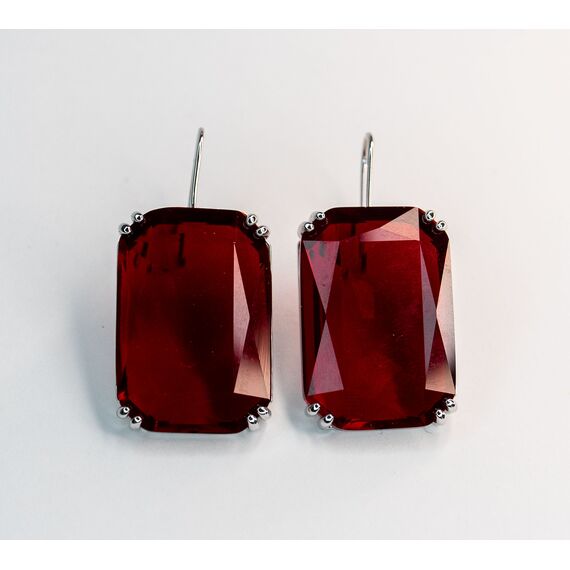 Серьги из гипоаллергенного ювелирного сплава серого цвета. Вставка- ювелирное стекло, цвет- красный. Высота серег-4см, ширина-2см. Застежка- петля.