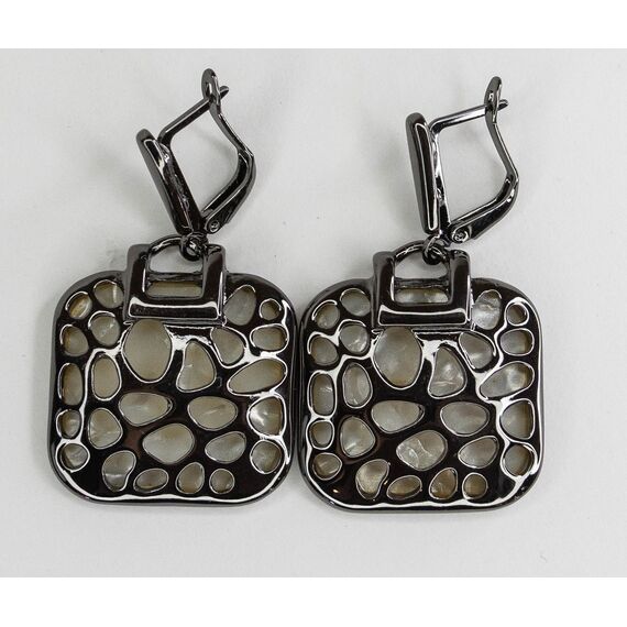 Серьги из гипоаллергенного ювелирного сплава черного цвета. Вставка - гелиотис (перламутр), цвет - белый. Английский замок (швенза - 1см). Высота серег - 4см, ширина - 2,5см.
