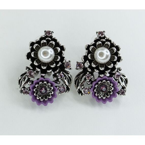 Серьги из гипоаллергенного ювелирного сплава ,цвет-серый, черный.Вставка-иск. жемчуг белого цвета , эмаль сиреневого цвета и ювелирное стекло,цвет сиреневый. Итальянский замок (швенза-1,2см и застежка -клипса).Высота серьги -4см,ширина-3см.