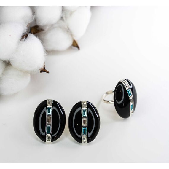 Серьги из гипоаллергенного ювелирного сплава серого цвета. Покрытие- эмаль черного цвета.Вставка- ювелирное стекло, цвет-белый, голубой. Итальянский замок( швенза- 1,2см и застежка- клипса) .Высота серег-3см, ширина-2,5см.