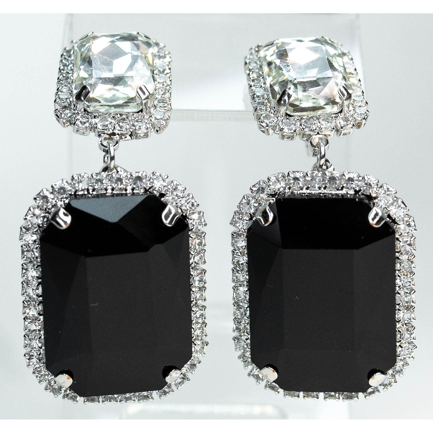 Серьги из гипоаллергенного ювелирного сплава серого цвета. Вставка- ювелирное стекло белого и черного цвета. Застежка- пусет. Высота серег-5см, ширина-2,5см.