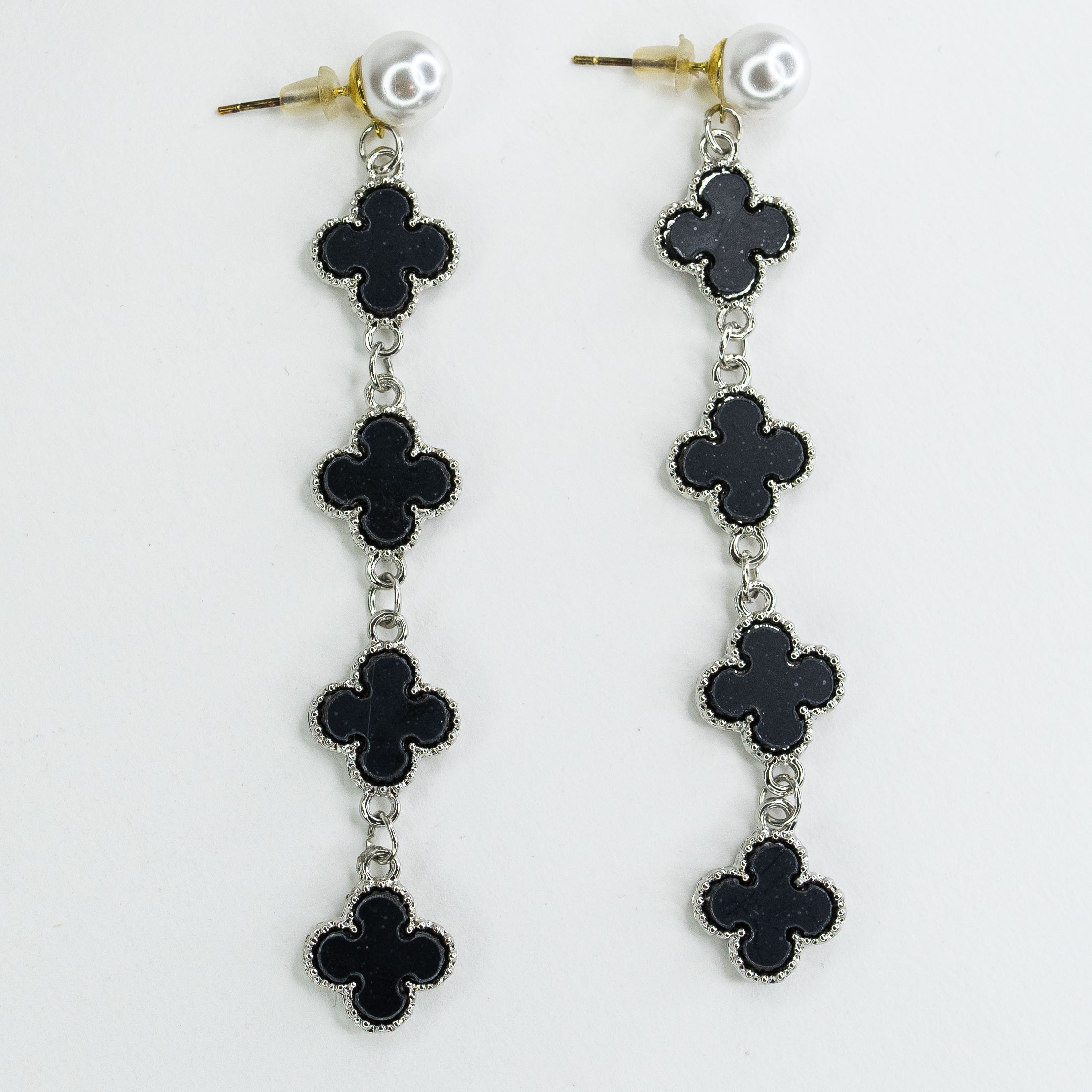 Серьги из гипоаллергенного ювелирного сплава серого цвета. Покрытие эмалью черного цвета. Вставка- иск. жемчуг белого цвета. Застежка- пусет. Высота серег-8см, ширина серёг-1см.