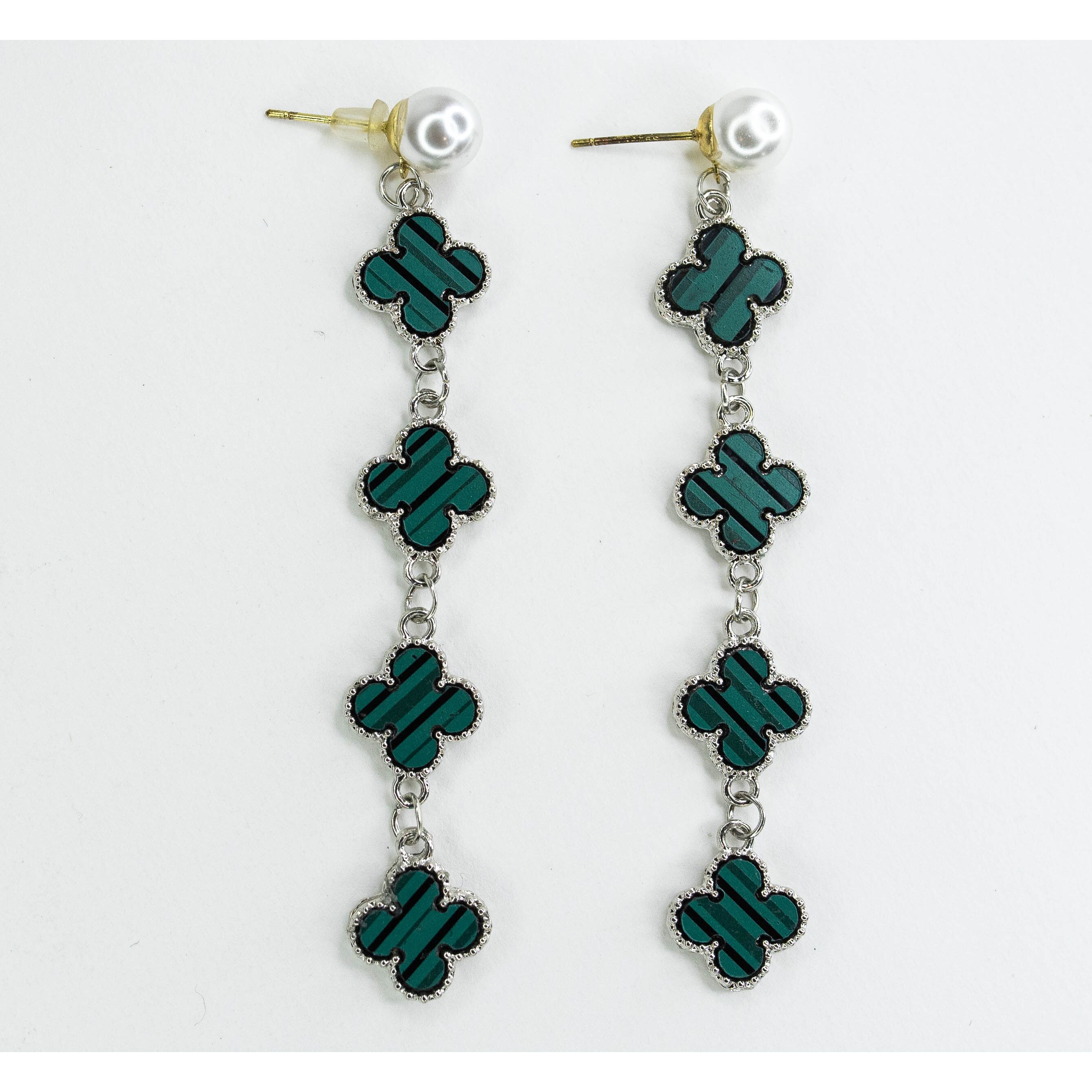 Серьги из гипоаллергенного ювелирного сплава серого цвета. Покрытие эмалью зеленого цвета. Вставка- иск. жемчуг белого цвета. Застежка- пусет. Высота серег-8см, ширина серёг-1см.