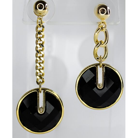 Серьги из гипоаллергенного ювелирного сплава желтого цвета. Вставка- ювелирное стекло черного цвета. Застежка- пусет. Высота серег-4см и 5см, ширина-2см.
