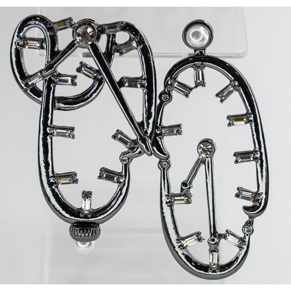 Серьги из гипоаллергенного ювелирного сплава черного цвета. Вставка- иск. жемчуг, цвет- белый и ювелирное стекло белого цвета. Застежка- пусет. Высота серег-5см, ширина-2см.