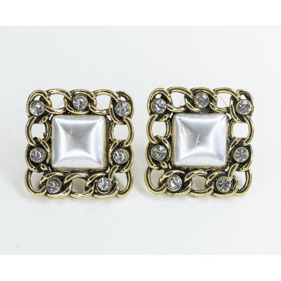 Серьги из гипоаллергенного ювелирного сплава желтого цвета. Вставка- ювелирное стекло и иск. жемчуг белого цвета. Застежка- пусет. Высота серег-2,5см, ширина-2,5см.