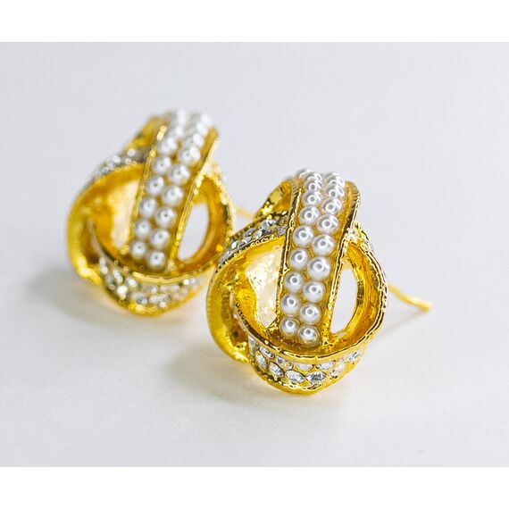 Серьги из гипоаллергенного ювелирного сплава желтого цвета. Вставка- ювелирное стекло и иск. жемчуг белого цвета. Застежка- пусет. Высота серег-1,5см, ширина-1,5см.