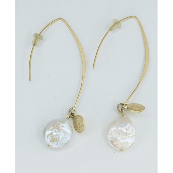 Серьги женские из гипоаллергенного ювелирного сплава желтого цвета. Вставка- барочный жемчуг белого цвета. Высота серег-6,0см, ширина- 1,0см. Застежка- пусет.