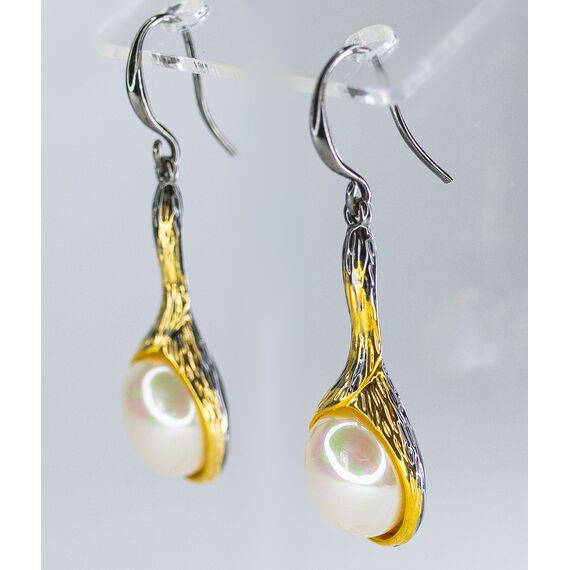 Серьги из гипоаллергенного ювелирного сплава черного и желтого цвета. Вставка- жемчуг иск. белого цвета. Высота серег-4,5см, ширина-1,5см. Застежка- петля.