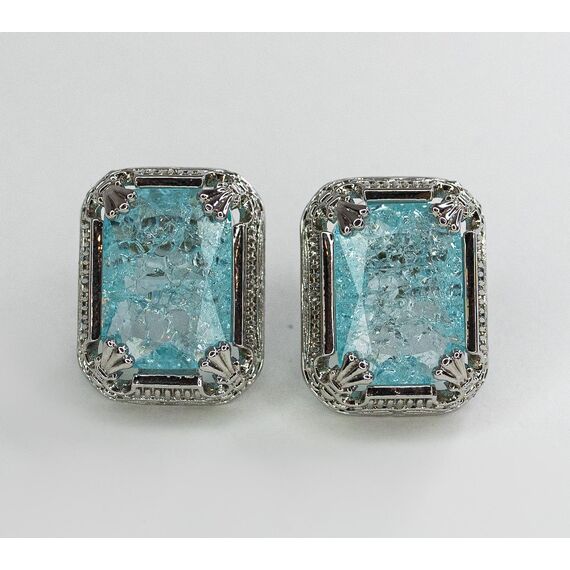 Серьги из гипоаллергенного ювелирного сплава серого цвета. Вставка- ювелирное стекло голубого цвета. Застежка- пусет. Высота серег-1,6см, ширина-1,4см.
