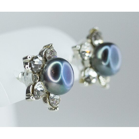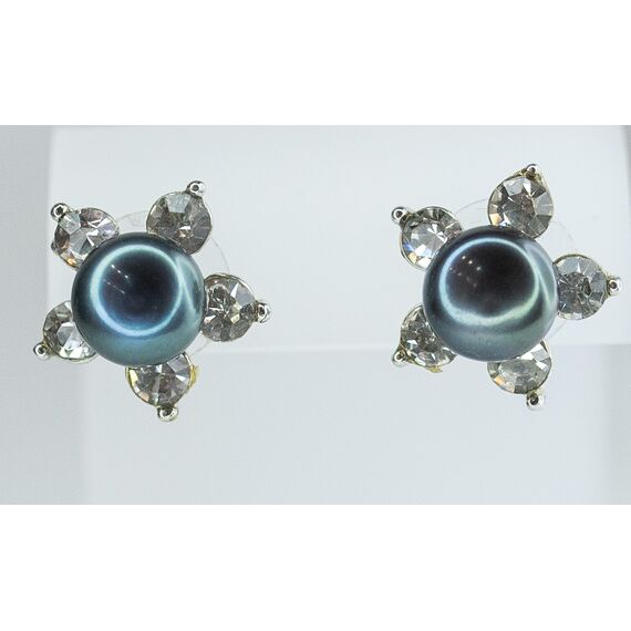 Серьги женские из гипоаллергенного ювелирного сплава серого цвета. Вставка- жемчуг иск. голубого цвета и ювелирное стекло белого цвета.. Высота серег- 2,0см, ширина- 2,0см. Застежка- петля.