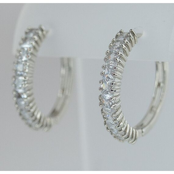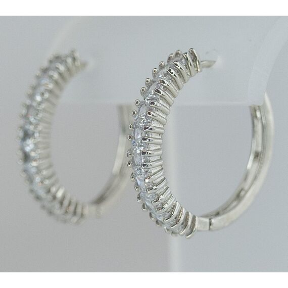 Серьги из гипоаллергенного ювелирного сплава серого цвета. Вставка- ювелирное стекло белого цвета. Высота серег- 7,0см, ширина- 1,0см. Застежка- конго.