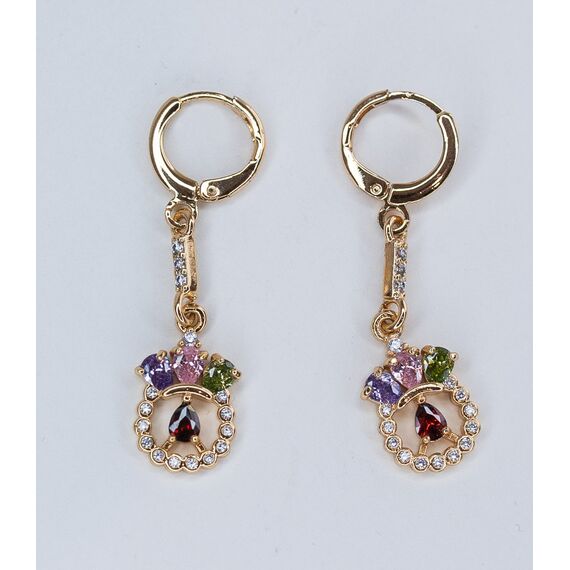 Серьги женские из гипоаллергенного ювелирного сплава желтого цвета. Вставка- ювелирное стекло, цвет- белый, розовый и желтый. Высота серег-4,0см, ширина- 1,5см. Застежка- пусет.