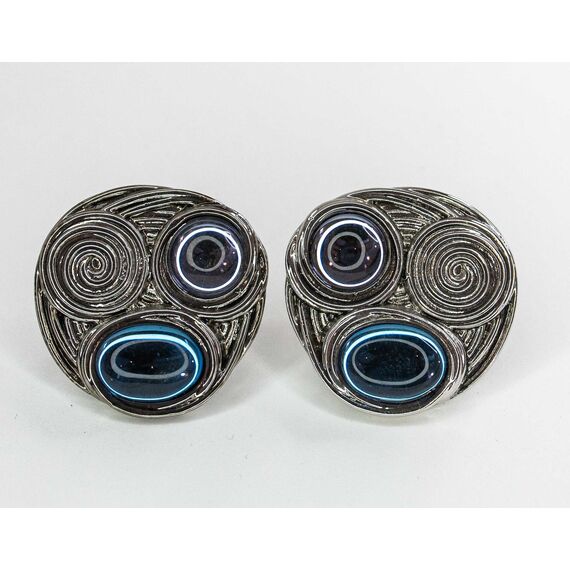 Серьги из гипоаллергенного ювелирного сплава серого цвета . Вставка- улексит (кошачий глаз) голубого и фиалетового цвета. Итальянский замок (швенза-1,2см и застежка-клипса). Высота серег-2,5см, ширина-3см.
