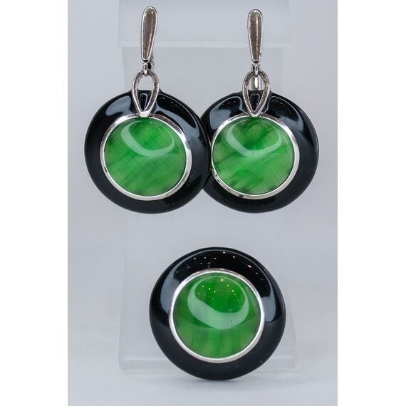 Серьги женские из гипоаллергенного ювелирного сплава серого цвета с покрытием эмалью черного цвета. Вставка- улексит, цвет-зеленый. Высота серег- 5,0см, ширина- 2,0см. Замок- английский ( штифт-1,0см).