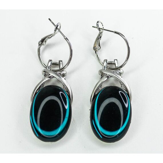 Серьги из гипоаллергенного ювелирного сплава серого цвета. Вставка- улексит( кошачий глаз) , цвет- лондон блю. Высота серёг-5см, ширина-1,6см. Итальянский замок( швенза-1,2см и застежка-клипса).