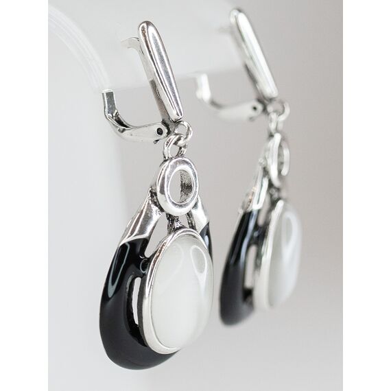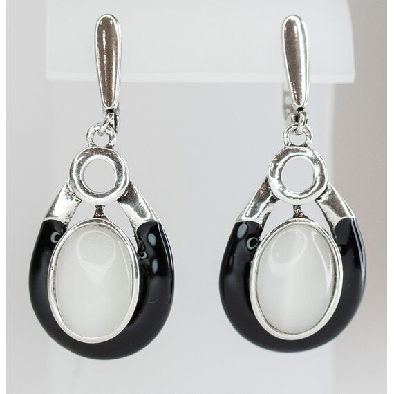 Серьги женские из гипоаллергенного ювелирного сплава серого цвета с покрытием эмалью черного цвета. Вставка- улексит (кошачий глаз) серого цвета. Высота серег- 5,0см, ширина- 2,0см. Английский замок (штифт-1,0см).