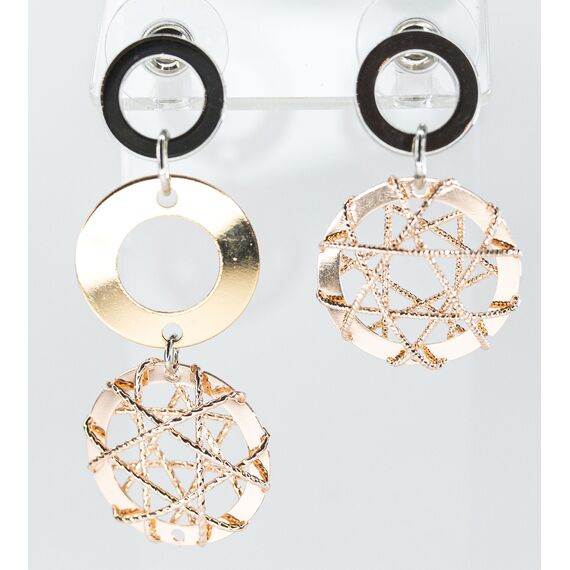 Серьги из гипоаллергенного ювелирного сплава серого и желтого цвета. Без вставок. Застежка- пусет. Высота серег-5см, ширина-2см.