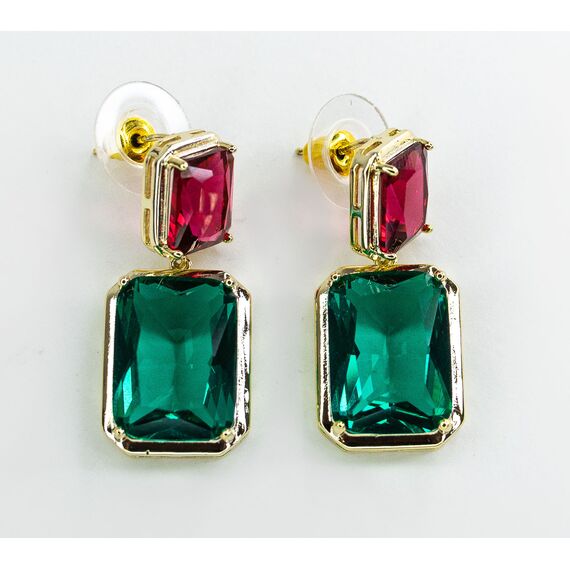 Серьги женские из гипоаллергенного ювелирного сплава желтого цвета. Вставка- ювелирное стекло розового и зеленого цвета. Высота серег-3,0см, ширина- 1,5см. Застежка- пусет.