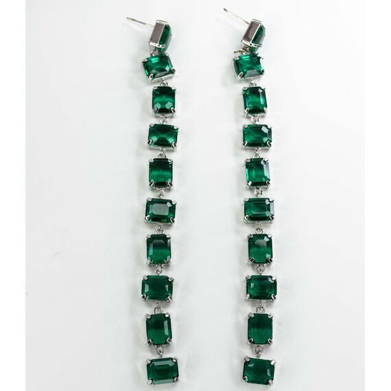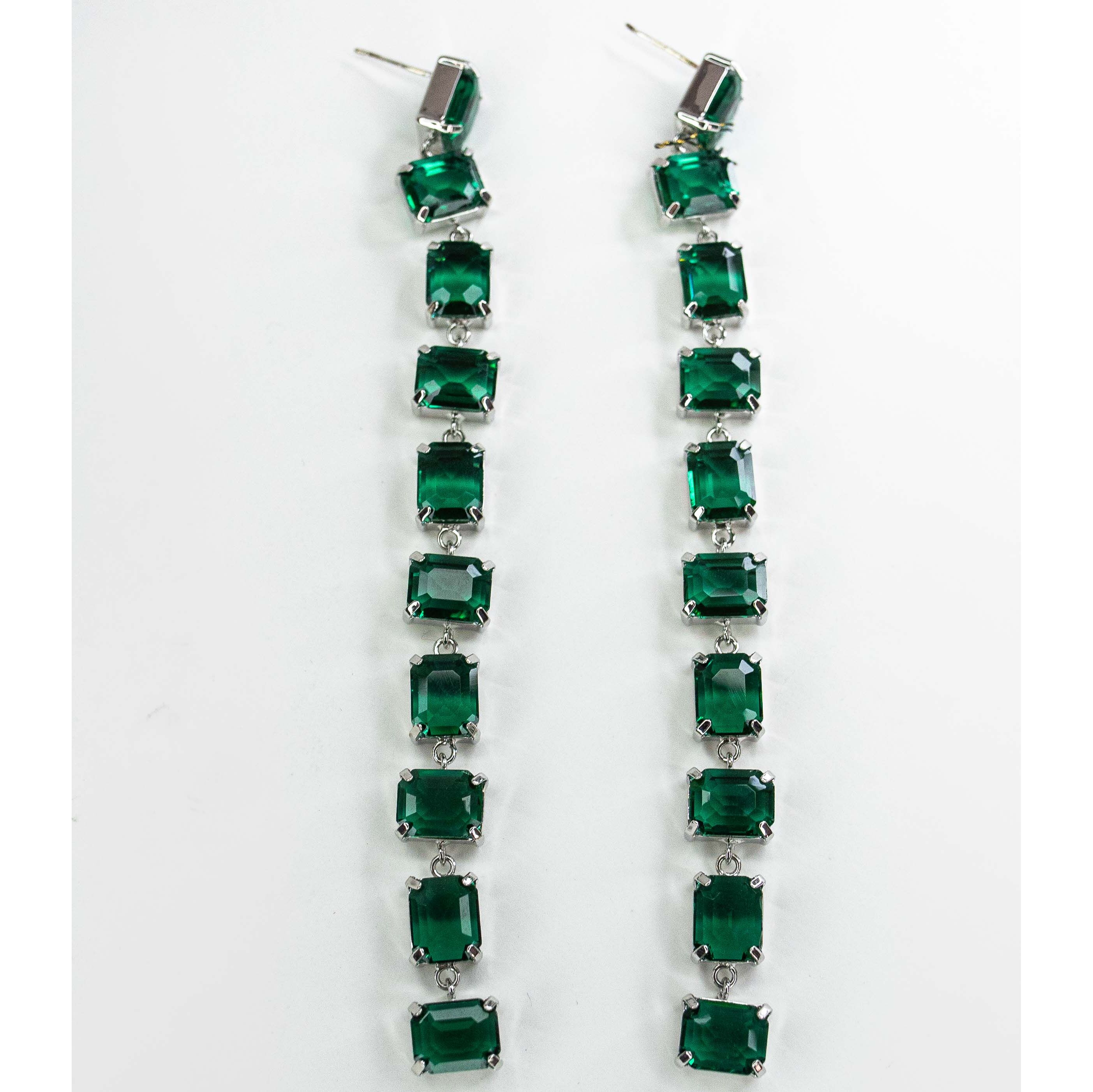 Серьги из гипоаллергенного ювелирного сплава серого цвета. Вставка- ювелирное стекло зеленого цвета. Высота серег-13см, ширина-1см. Застежка-пусет.