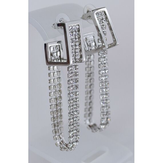 Серьги женские из гипоаллергенного ювелирного сплава серого цвета. Высота серег- 6,0м, ширина-1,0см. Вставка- ювелирное стекло белого цвета. Застежка- пусет.