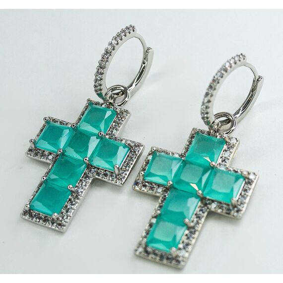 Серьги из гипоаллергенного ювелирного сплава серого цвета. Вставка- улексит зеленого цвета и цирконы белого цвета. Высота серег-4см, ширина-2см. Застежка- скоба.
