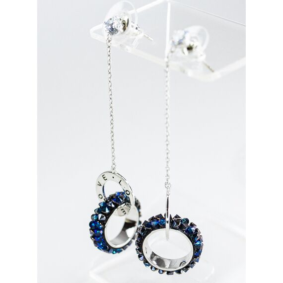 Серьги из гипоаллергенного ювелирного сплава серого цвета. Вставка- ювелирное стекло синего и белого цвета. Высота серег-5,5см, ширина-1,0см. Застежка- пусет.