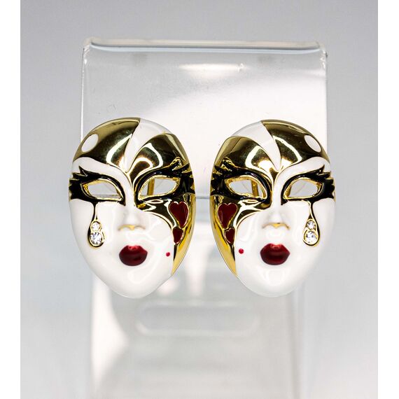 Серьги из гипоаллергенного ювелирного сплава желтого цвета. Вставка- ювелирное стекло белого цвета. Покрытие эмалью, цвет-белый, черный, красный. Высота серег-3см, ширина-2см. Итальянский замок ( швенза-1,2см и застежка- клипса).
