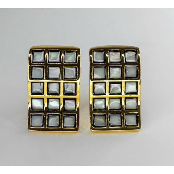 Серьги из гипоаллергенного ювелирного сплава желтого цвета. Вставка - гелиотис (перламутр), цвет -серый. Английский замок (швенза - 1см). Высота серег - 3см, ширина - 1,7см.