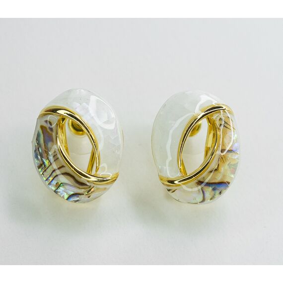 Серьги из гипоаллергенного ювелирного сплава желтого цвета. Вставка - гелиотис (перламутр), цвет - белый и микс. Итальянский замок (швенза-1,2см и застежка - клипса). Высота серег - 2см, ширина - 1,5см.