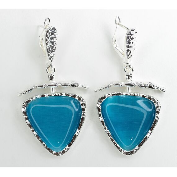 Серьги из гипоаллергенного ювелирного сплава серого цвета. Вставка- улексит( кошачий глаз) , цвет- голубой. Высота серёг-5см, ширина-3см. Английский замок( швенза-1см).