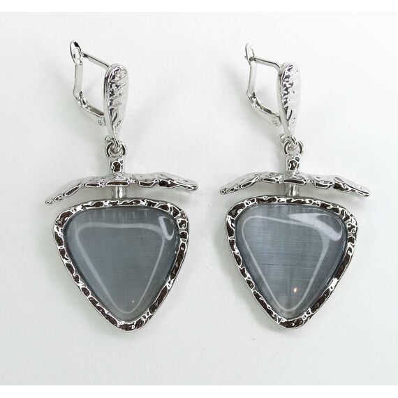 Серьги из гипоаллергенного ювелирного сплава серого цвета. Вставка- улексит( кошачий глаз) , цвет- серый. Высота серёг-5см, ширина-3см. Английский замок( швенза-1см).