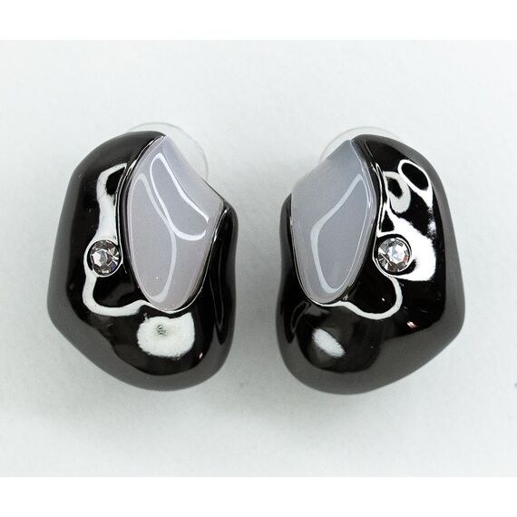 Серьги из гипоаллергенного ювелирного сплава черного цвета. Вставка- ювелирное стекло белого цвета и пластик серого цвета. Высота серег-2,5см, ширина-2см. Итальянский замок( швенза-1,2см и застежка-клипса).