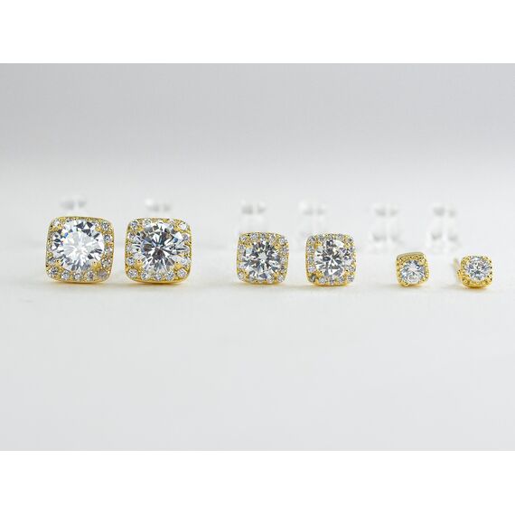 Серьги из гипоаллергенного ювелирного сплава желтого цвета. Вставка- ювелирное стекло белого цвета. Застежка- пусет. Высота и ширина серёг- 0,7см, 0,5см, 0,3см ( в комплекте- 4шт.).
