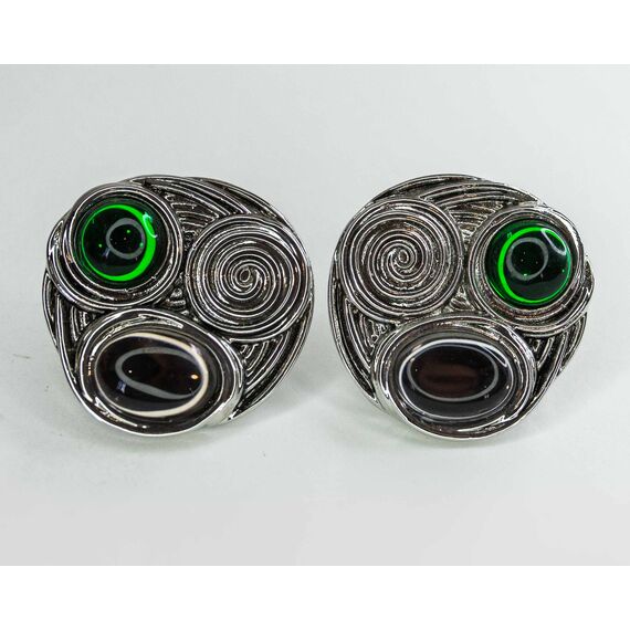 Серьги из гипоаллергенного ювелирного сплава серого цвета . Вставка- улексит ( кошачий глаз) зеленого и серого цвета. Итальянский замок (швенза-1,2см и застежка-клипса). Высота серег-2,5см, ширина-3см.