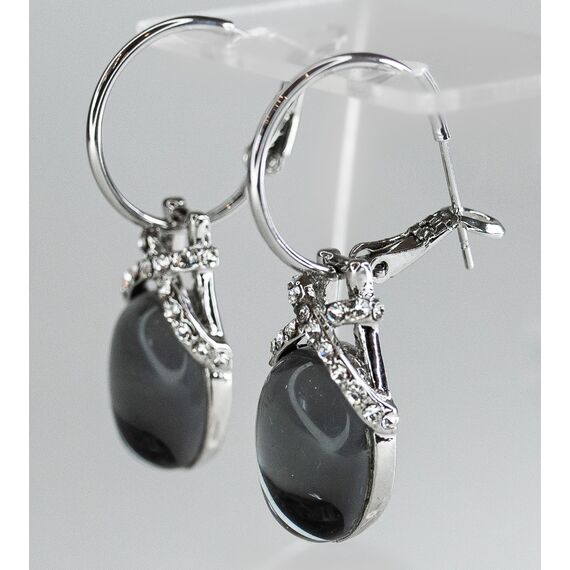 Серьги из гипоаллергенного ювелирного сплава серого цвета. Вставка- улексит( кошачий глаз) серого цвета и ювелирное стекло белого цвета. Итальянский замок ( швенза-1,2см и застежка- клипса). Высота серег-4см, ширина-1,2см.