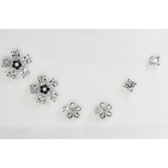 Серьги ( три пары серег разного дизайна) из гипоаллергенного ювелирного сплава серого цвета. Вставка в серьгах- ювелирное стекло белого и черного цвета. Высота - от-0,2см до 1см. Застежка- пусет.