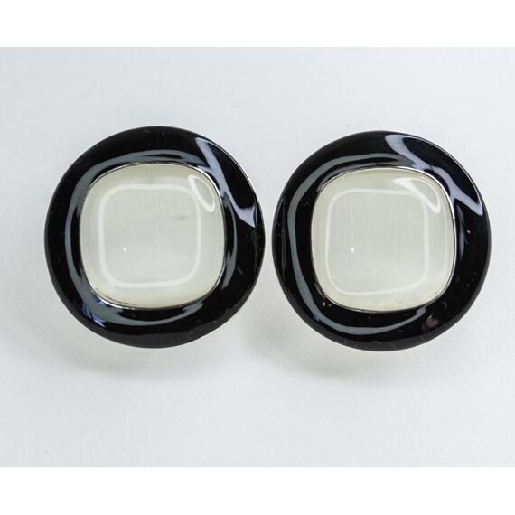 Серьги из гипоаллергенного ювелирного сплава серого цвета. Вставка- улексит( кошачий глаз) белого цвета. Покрытие эмалью черного цвета. Итальянский замок (швенза-1,2см и застежка- клипса). Высота серег-3см, ширина -3см.