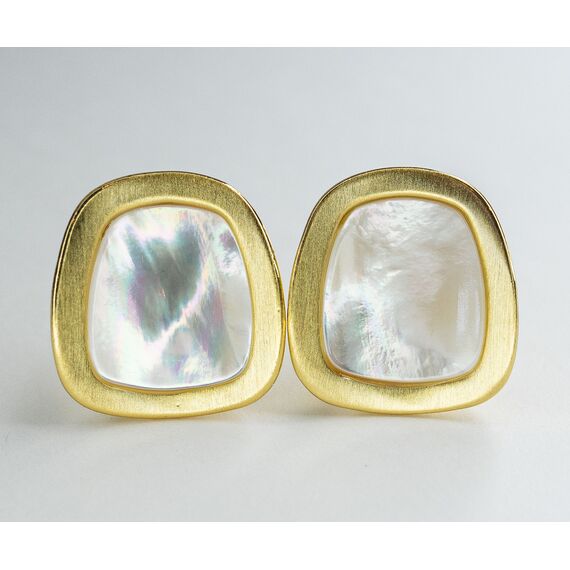 Серьги из гипоаллергенного ювелирного сплава желтого цвета. Вставка- перламутр белого цвета. Высота серег-2см, ширина -2см. Итальянский замок (швенза-1,2см и застежка- клипса).