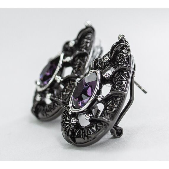 Серьги из гипоаллергенного ювелирного сплава черного и серого цвета. Вставка- ювелирное стекло фиолетового цвета. Высота серег-2,5см, ширина-2см. Итальянский замок( швенза-1,2см и застежка-клипса).