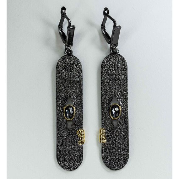 Серьги из гипоаллергенного ювелирного сплава черного и желтого цвета. Вставка- ювелирное стекло коричневого цвета. Высота серег-7см, ширина -1,2см. Английский замок (швенза-1см).