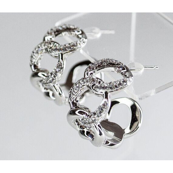 Серьги из гипоаллергенного ювелирного сплава серого цвета. Вставка- ювелирное стекло белого цвета. Застежка- пусет. Высота серег-2см, ширина-1см.