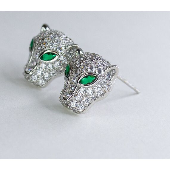 Серьги из гипоаллергенного ювелирного сплава серого цвета. Вставка- ювелирное стекло белого и зелёного цвета. Застежка- пусет. Высота серег-1,5см, ширина серёг-1см.